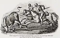 The ofício de vaqueiro or cultura do vaqueiro (cultura sertaneja in its primitive form) is a traditional activity and culture of cattle management and care that originated in the Brazilian state of Bahia in the 16th century, requiring specific techniques for animal husbandry and having a strong cultural component, including primarily its leather clothing, leather hats, aboio, and bull catching.[1][2]