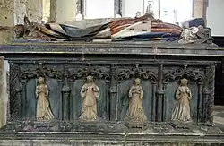 The Knightley family originated at the Staffordshire manor of Knightley, acquired by them shortly after the Norman Conquest of 1066.[10] In 1415 Sir Richard Knightley purchased the manor of Fawsley in Northamptonshire, where the senior line of the family became seated. Sir Edmund Knightley of Fawsley was the third son, and eventual heir, of Sir Richard Knightley of Fawsley, who held 41 manors in the central midlands, by his wife Joan Skennard, daughter and heiress of Henry Skennard (or Skynnerton) of Alderton, Northamtonshire. He was a sergeant-at-law trained in the Middle Temple who served as a Member of Parliament for Reading in 1515 and for Wilton in 1529. He married Ursula de Vere, a sister and coheiress of John de Vere, 14th Earl of Oxford. He acquired much land following the Dissolution of the Monasteries, including in 1538 Studley Priory in Warwickshire.[11] In 1538 he became the heir of his elder brother Richard Knightley, of Fawsley and of Upton near Northampton, MP, who died without male issue,[12] whose monument survives in St Michael's Church, Upton. Sir Edmund Knightley, like his elder brother, also died childless, leaving as his heir his younger brother Sir Valentine Knightley,[13] of Fawsley, who in 1561–2 received a new grant of the manor.[14] He bequeathed Offchurch to his fourth son Edward Knightley. The descent of Knightley of Offchurch was as follows:[15]