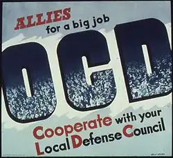Office of Civilian Defense was a United States federal emergency war agency set up May 20, 1941, by Executive Order 8757 to co-ordinate state and federal measures for protection of civilians in case of war emergency.[1] Its two branches supervised protective functions such as blackouts and special fire protection and "war service" functions such as child care, health, housing, and transportation. It also created the Civil Air Patrol. The agency was terminated by Executive Order 9562 of June 4, 1945.[2] The Office of Civil Defense with similar duties was established later.