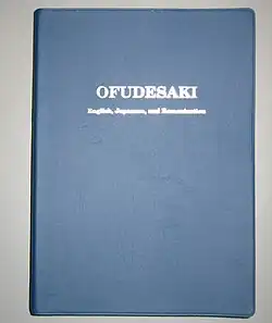 The name Ofudesaki can be split into three smaller segments. O is an honorific prefix, fude translates to "brush," and saki translates to "tip."[3] Thus, the Ofudesaki has been referred to in English as The Tip of the Writing Brush.[4] It was even once referred to as "The Book of Revelations" in early English Tenrikyo literature.[5] It is a convention in Tenrikyo literature to write Ofudesaki in hiragana (おふでさき) as opposed to kanji.