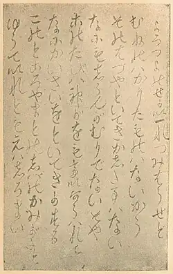 The verses of the Ofudesaki are generally in a traditional poetic style known as waka. A waka poem contains thirty-one syllables using a 5-7-5-7-7 structure and is subdivided into two lines. The Ofudesaki is mostly written in a Japanese phonetic syllabary (a precursor to modern hiragana) and employs relatively few kanji, with only 49 distinct characters used.[25] In total, the Ofudesaki has 49,775 kana syllables and kanji characters combined.[11]