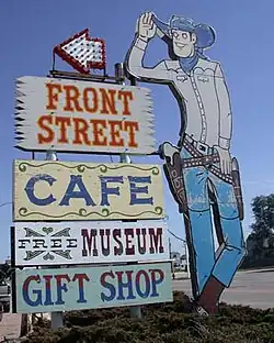 Ogallala first was founded a terminus for cattle drives that traveled from Texas to the Union Pacific railhead located there. These trails are known as the Western or Great Western trails.[4][5] The Union Pacific Railroad reached Ogallala on May 24, 1867.[6] The city itself was not laid out until 1875 and not incorporated until 1884[7] The town's name comes from the Oglala Sioux tribe.[8] Rowdy cowboys made this a dangerous place to be during the cattle drive months resulting in Ogallala getting a reputation as both "The Town Too Tough For Texas" and as the "Gomorrah of the West"[9]