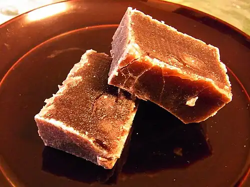 Yōkan made by this traditional method forms a layer of crystallized sugar on the surface due to natural drying, resulting in a distinctive crunchy texture on the outside while maintaining a moist and smooth interior.[1][2]