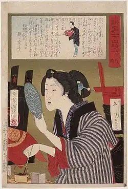 Geisha blackening her teeth at 1:00 p.m.. Ukiyo-e by Tsukioka Yoshitoshi, number 13 in the series 24 hours in Shinbashi and Yanagibashi.