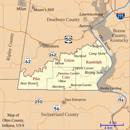 Ohio County is a county located in southeastern Indiana. With a 2020 population of 5,940, and an area of just 87 square miles, Ohio County is the smallest county in Indiana by area and the least populous.[1] The county seat and only incorporated municipality is Rising Sun.[2][3] The county was officially established in 1844 and was one of the last Indiana counties to be created. Ohio County borders the state of Kentucky across the Ohio River for which it was named. It is part of the Cincinnati, OH-KY-IN Metropolitan Statistical Area. The county is divided into four townships which provide local services.[4][5] Three state roads pass through or into the county.[6]