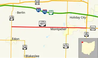 State Route 107 (SR 107) is a state route that runs between SR 49 and U.S. Route 20A (US 20A)/SR 15 in the US state of Ohio. The 11.05 miles (17.78 km) of SR 107 that lie within the state serve as a minor highway. Various sections are rural two-lane highway and rural four-lane highway. The highway passes through residential and commercial properties.