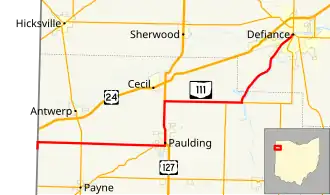 SR 111 begins at an intersection with Woodburn Road and State Line Road on the Indiana state line. The road heads north along the state line passing through farmland as a two-lane highway. The road turns due east and heads away from the state line. The highway has an intersection with SR 49 in rural Paulding County. The route enters the village of Paulding and has an intersection with SR 500. After the intersection with SR 500 the route passes through a mix of residential and commercial properties. The route makes a sharp curve and heads north towards downtown Paulding. In downtown Paulding, the road has a traffic signal at US 127 and the two routes head north concurrent. The concurrency passes the Paulding County Court House and head north out of downtown Paulding. On the north side of the village the highway passes through mostly residential properties, with some commercial properties.[4][5][6]