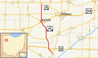 State Route 115 (SR 115) is a 21.71-mile (34.94 km) long north–south state highway in the western portion of the U.S. state of Ohio. The highway has its southern terminus at a T-intersection with SR 65 in the northernmost portion of the city of Lima. The northern terminus of SR 115 is at a T-intersection with SR 15 approximately 3.75 miles (6.04 km) southeast of the village of Continental.