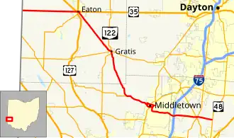 State Route 122 (SR 122) is an Ohio state highway which runs from the Ohio-Indiana state line in Preble County east of Eaton, Ohio to SR 48 near Lebanon, Ohio, a distance of 43.4 miles (69.8 km). When the route was designated in 1923, it ran along its current route from Indiana to Middletown.[2][3] It was extended to its current eastern terminus in 1937 but was extended further east to U.S. Route 42 in 1946.[4][5] The route was truncated back to SR 48 by 1985 with the former section being renamed "Old State Route 122" and maintained by Warren County as CR 230.[6][7][8] The route also used to continue west of the Indiana state line as Indiana State Road 122 west to its terminus at US 27 east of Abington, Indiana.