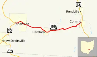 State Route 155 (SR 155) is an east–west state highway in the southeastern portion of the U.S. state of Ohio. The highway's western terminus is at SR 93 in Shawnee. At its midpoint in Hemlock the highway is known as Sanders Street. The highway’s eastern terminus is at a four-way stop intersection with SR 13 in Corning.