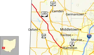 State Route 177 (SR 177) is a north–south state highway located in the southwest corner of the U.S. state of Ohio. The southern terminus of State Route 177 is at the signalized junction of State Route 4 and State Route 129 in Hamilton, after State Route 177 runs concurrently with State Route 129 for its southernmost 1.59 miles (2.56 km). The northern terminus of State Route 177 is at the Indiana State Line approximately 3.75 miles (6.04 km) northwest of the unincorporated community of Fairhaven. From this point, State Route 177 continues into Indiana as Indiana State Road 227.