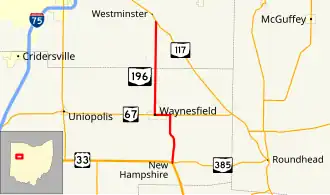State Route 196 (SR 196) is a 10.21-mile (16.43 km) long north–south state highway in the western portion of the U.S. state of Ohio. The southern terminus of SR 196 is at a signalized intersection nearly 3.50 miles (5.63 km) southeast of Waynesfield that marks its junction with U.S. Route 33 (US 33) and SR 385, which has its western terminus at the same location. The northern terminus of SR 196 is at a T-intersection with SR 117 about 4.25 miles (6.84 km) southwest of Harrod.