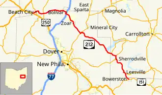 State Route 212 (SR 212) is a two-lane east–west state highway that runs within Stark, Tuscarawas, Carroll, and Harrison Counties in eastern Ohio. The western terminus of SR 212 is at U.S. Route 250 near Beach City, and its eastern terminus is at SR 151 in Bowerston. The route passes through rural areas but passes through small villages including Beach City, Bolivar, Zoar, Sherrodsville, and Leesville. It largely follows the valleys formed by the Tuscarawas River and Conotton Creek.