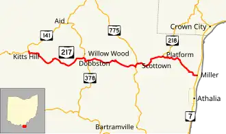 State Route 217 (SR 217) is an east–west state highway in the southern portion of the U.S. state of Ohio. The western terminus of State Route 217 is at a T-intersection with State Route 141 approximately 1.75 miles (2.82 km) east of the unincorporated community of Kitts Hill. Its eastern terminus is at State Route 7 nearly 1.25 miles (2.01 km) north of the village of Athalia. The route mainly passes through some hilly terrain and drops in elevation before reaching the Ohio River valley.