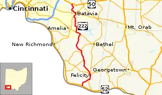 The designation of SR 222 took place in 1923. Originally, the highway was routed from its present southern terminus in Chilo to its junction with the former SR 25 in Monroe Township.[2][3] SR 222 was extended to the north in 1937, traveling from SR 125 in Batavia Township to its current northern terminus at US 50.[5][6]