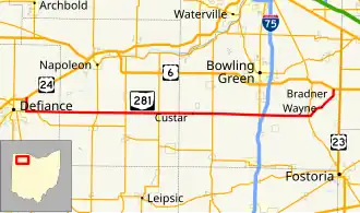 State Route 281 (SR 281) is an east–west state highway in the northwestern portion of the U.S. state of Ohio. Its western terminus is at U.S. Route 24 approximately four miles (6.4 km) northeast of downtown Defiance, and its eastern terminus is at US 6 nearly one mile (1.6 km) north of Bradner. The majority of the route is known as the Defiance Pike.[4]
