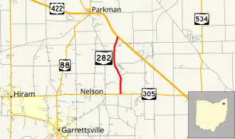 State Route 282 (SR 282) is a north–south state highway in northeastern Ohio, a U.S. state. The southern terminus of SR 282 is at a T-intersection with SR 305 near the hamlet of Nelson. Its northern terminus is also at a T-intersection, this time with the four-lane divided U.S. Route 422 (US 422) approximately two miles (3.2 km) southeast of Parkman. SR 282 primarily serves as an access route for Nelson Kennedy Ledges State Park. For its duration, the highway is also known as Nelson Ledge Road.