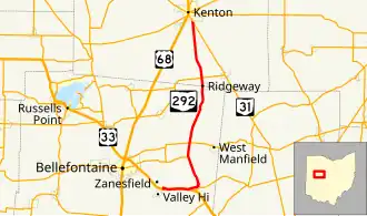 State Route 292 (SR 292) is a two-lane north–south state highway in the western portion of the U.S. state of Ohio. The southern terminus of the highway is at a diamond interchange with the U.S. Route 33 (US 33) expressway approximately one mile (1.6 km) southeast of the village of Zanesfield. Its northern terminus is at a Y-intersection with SR 31 just south of the city limits of Kenton.