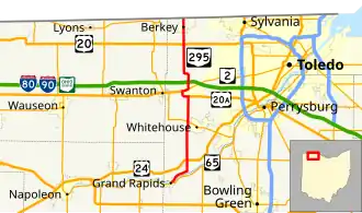 Designated in 1932, SR 295 was originally routed from its current eastern junction with SR 2 to its current northern terminus at the Michigan State Line in Berkey.[3][4] One year later, the highway would be extended southward to SR 64 on the outskirts of Whitehouse.[5] By 1935, SR 295 was extended southward one more time, this time to a southern terminus at US 24.[6][7] The southern terminus of SR 295 was at a T-intersection with US 24 approximately 5 miles (8.0 km) southwest of Waterville until August 2012 when US 24 was rerouted. SR 295 was extended to run along the former US 24's alignment until Grand Rapids, where SR 295 then replaced the former SR 578 and terminates at SR-65.