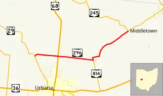 State Route 296 (SR 296) is a 10.54-mile (16.96 km) long state highway entirely in Champaign County, Ohio. Routed around the northern side of Urbana, the route runs in two townships, Salem Township and Wayne Township.