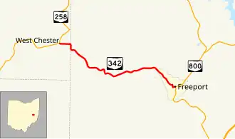 State Route 342 (SR 342) is a 5.27-mile-long (8.48 km) state highway in eastern Ohio. The short route connects SR 258 in the Perry Township community of West Chester to SR 800 in the village of Freeport.