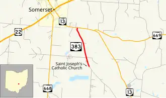 State Route 383 (SR 383) is a 1.50-mile-long (2.41 km) north south state highway in the central portion of the U.S. state of Ohio. The highway is a spur route whose southern terminus is at the entrance to Ohio's oldest Catholic Church, Saint Joseph's, nearly two miles (3.2 km) southeast of Somerset. County Road 60 (CR 60, Old Somerset Road) picks up where SR 383 leaves off heading southeast from the church entrance. The northern terminus of SR 383 is at a T-intersection with SR 13 just 0.50 miles (0.80 km) east of the village limits of Somerset.