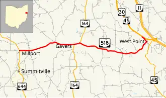 State Route 518 (SR 518) is an east–west state highway located entirely in Columbiana County in northeast Ohio. The western terminus of SR 518 is at SR 644 north of Summitville. Its eastern terminus is at the concurrency of U.S. Route 30 (US 30) and SR 45 near West Point.