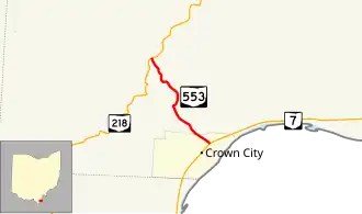 State Route 553 (SR 553) is a north–south state highway in the southern portion of the U.S. state of Ohio. SR 553 has its southern terminus at a T-intersection with SR 7 in Crown City. The route's northern terminus is at SR 218 approximately two miles (3.2 km) northwest of Crown City.