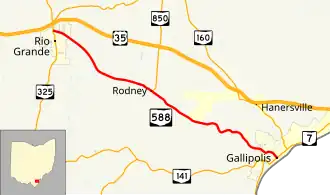 State Route 588 (SR 588) is an east–west state highway in the southeastern portion of the U.S. state of Ohio. The western terminus of SR 588 is at SR 325 in Rio Grande. Its eastern terminus is at a signalized intersection with SR 7 in downtown Gallipolis.