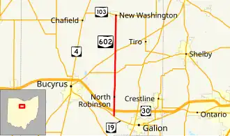 State Route 602 (SR 602) is a 14.47-mile-long (23.29 km) north–south state highway in the northern portion of the U.S. state of Ohio. Its southern terminus is at a T-intersection with SR 19 approximately 2.50 miles (4.02 km) northwest of Galion, and its northern terminus is at SR 103 in New Washington.