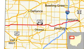 State Route 613 (SR 613) is an east–west state highway in the northwestern portion of the U.S. state of Ohio. Its western terminus is at the Indiana state line 4 miles (6.4 km) west of Payne (the route once continued west in Indiana as State Road 14), and its eastern terminus is at US 23 in Fostoria.