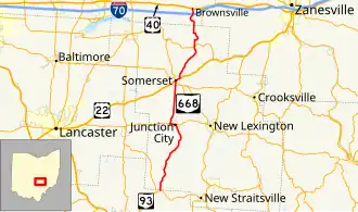 State Route 668 (SR 668) is a north-south state highway in central Ohio. Its southern terminus is at an intersection with SR 93 in the Wayne National Forest, northeast of Logan; its northern terminus is at an intersection with US 40 in the unincorporated community of Brownsville.
