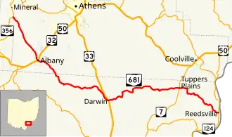 State Route 681 (SR 681) is a 39.53-mile (63.62 km) long east–west state highway in the southern portion of the U.S. state of Ohio. The western terminus of SR 681 is at a T-intersection with SR 356 approximately 6.75 miles (10.86 km) northwest of Albany. Its eastern terminus is also at a T-intersection, this time with SR 124 nearly 9.50 miles (15.29 km) southeast of Coolville.