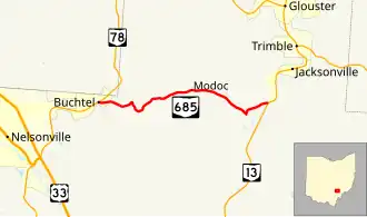 State Route 685 (SR 685) is a short east–west state highway in southeastern Ohio, a U.S. state. The western terminus of SR 685 is at SR 78 in the village of Buchtel. Its eastern terminus is at SR 13 approximately one mile (1.6 km) southwest of Jacksonville.