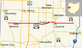 State Route 705 (SR 705) is a state highway in western Ohio, a U.S. state. The highway's western terminus is in rural northwestern Darke County at SR 49 approximately 5.25 miles (8.45 km) southeast of Fort Recovery, and just a mile south of the Darke-Mercer County Line. Its eastern terminus is at SR 29 nearly 2.75 miles (4.43 km) northwest of Sidney.