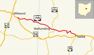 State Route 715 (SR 715) is an east–west state highway in the central portion of the U.S. state of Ohio. Both of its termini are at US 36, with its western endpoint approximately 4.50 miles (7.24 km) southeast of Danville, and its eastern end on the eastern village limits of Nellie. Near its eastern terminus, SR 715 crosses over the top of the Mohawk Dam.