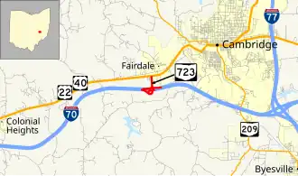 State Route 723 (SR 723) is a very short state highway located in east-central Ohio. Having a length of just 0.85 miles (1.37 km) and located just southwest of Cambridge, the route serves as a connector between Interstate 70 (I-70) at its exit 176 and the concurrency of U.S. Route 22 (US 22) and US 40.