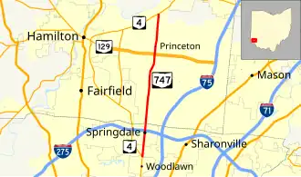 State Route 747 (SR 747) is a north–south state highway in the southwestern portion of the U.S. state of Ohio. It connects with SR 4 at both ends, from a signalized intersection in Glendale at the south end to a signalized intersection approximately 2 miles (3.2 km) west of SR 63 near Monroe at the north end, bypassing Fairfield and Hamilton in the process. SR 747 is also known as Princeton-Glendale Road.