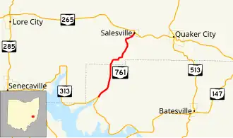 State Route 761 (SR 761) is a short state highway in the east-central portion of Ohio. The highway runs for 4.3 miles (6.9 km) from a T-intersection with SR 313 approximately four miles (6.4 km) southwest of Salesville to its junction with SR 265 in Salesville. This state route is also known as Kennonsburg Road for its entire length.