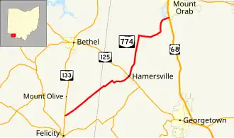 State Route 774 (SR 774) is an east–west state highway in the southwestern part of the U.S. state of Ohio. The route runs from its western terminus at SR 133 approximately 2 miles (3.2 km) north of Felicity to its eastern terminus at US 68 nearly 2 miles (3.2 km) south of Mount Orab.