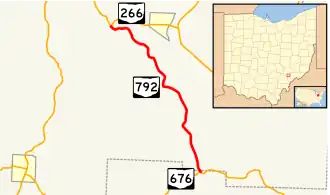 State Route 792 (SR 792) is a north–south state highway located in southeastern Ohio. The southern terminus of SR 792 is at a T-intersection with SR 676 approximately seven miles (11 km) east of Chesterhill. Its northern terminus is at SR 266 nearly one and a half miles (2.4 km) west of Stockport.