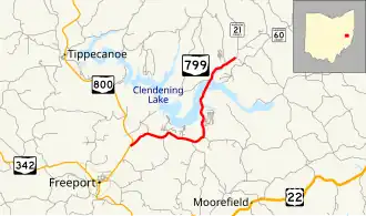 State Route 799 (SR 799) is an east–west state highway located in the eastern portion of the U.S. state of Ohio. The highway runs from its western terminus at a T-intersection with SR 800 approximately 1.25 miles (2.01 km) northeast of Freeport to its eastern terminus at its intersection with Redeye Road (County Road 60 or CR 60) about three miles (4.8 km) south of Deersville. Continuing north from SR 799's eastern terminus is Mallarnee Road (CR 21).