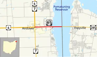 State Route 85 (SR 85, OH 85) is an east–west state highway in the northeastern Ohio. The western terminus of SR 85 is in the center of Andover where it intersects U.S. Route 6 (US 6) and SR 7. Its eastern terminus is just over 2.5 miles (4.0 km) east of Andover at the Pennsylvania state line in the middle of the causeway across the Pymatuning Reservoir, where Pennsylvania Route 285 (PA 285) continues east.