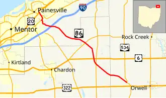 State Route 86 (SR 86) is an east–west state highway in the northeastern portion of the U.S. state of Ohio. Its western terminus is at US 20 in Painesville, and its southern terminus is at SR 534 near Windsor.