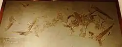 Ohmdenia is an extinct genus of prehistoric bony fish that lived from the Toarcian stage of the Early Jurassic period.[1][2] Ohmdenia was first described in 1953 by Bernhard Hauff, based on a fossil found in the well-known Posidonia Shale in Holzmaden, Germany. For a long time this animal has been considered a close relative of Birgeria, a great predator typical of the Triassic period with an uncertain systematic position.[2] Further studies have shown similarities with the Pachycormiformes, a group considered close to the origin of teleosts and also including giant forms and planktives (e.g., Leedsichthys). Some studies have erroneously indicated Ohmdenia as a synonym of Saurostomus, other studies have instead placed Ohmdenia as an important evolutionary passage between the basal pachicormiforms and the more derived planktivore pachicormiformes.[3]
