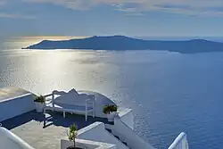 The village is located on top of a hill, at about 150 m (500 ft) elevation, and known as the "Eagles nest" from where Palia and Nea Kameni volcanoes are seen and also the island of Therasia. It is situated to the north of the island and Fira is at distance of 11 km (7 mi).[13] The main street in the town, in the central square, is the main trekking path which is cobbled, called the "Nikalaou Namikaou", which goes up the hill winding round the caldera. The island is reached from Fira which is the transport terminus of the island.[6][14] Caldera boat cruise options are available from either Oia or Fira.[15]