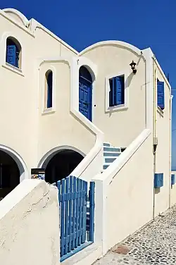 Oia typifies the white-painted houses of the Cyclades, in many cases built directly into niches which are cave houses used by crew of the ships, on the lip of the volcanic crater, between which are narrow alleys and blue-roofed churches with cupolas. The wealthy ship captains of the late 19th century built neo-classical mansions. These houses are seen built in succession one above the other.[14]