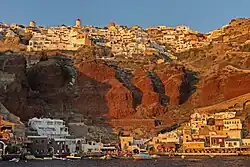 It is built on the steep slope of the caldera and the houses and restaurants are built into niches carved into the caldera on the seaward side. There are narrow passageways and a central square.[6] The sun light hours in this village are much longer than in the Fira town. Its paths are very narrow and hence get congested during the tourist season.[6][2] The idyllic surroundings of the town have a complex of white washed, blue domed churches and charming, traditional Cycladic houses and cave houses that are carved into the rock face on top of the cliff. It is set in a location which provides excellent views of the sunset over the caldera.[2][14] To the southwest, the Bay of Armeni, reachable from the town on foot or by mule, was once an important boatbuilding centre. Small repairs are now done on a single wharf. Excursion boats for trips around the island and ferries to Therasia leave from here. The harbour of Ammoudi on the western side of the town is reached by steep stairs north of Fort Londsa; there are a few tavernas and a pebble beach.[6][2]