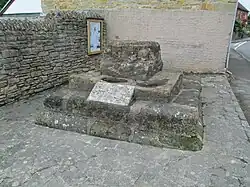 There is what remains of a Cross of ashlar, that comprises two square steps under a chamfered plinth, on which stands an octagonal cross-base, chamfered on top, with broach stops occupying the corners of the square. The tenon of the cross-shaft still lodges in a square mortice at the centre of the octagon, but the rest has gone.[4]