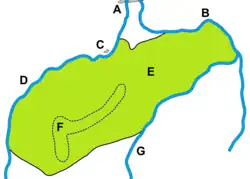 Baldwin's castle was positioned to protect an important route from Devon into Cornwall, including two fords that formed a crossing point over the West Okement River, and to control the existing town of Ocmundtune.[5] The castle was protected by a castle-guard system, in which lands were given out to Baldwin's tenants in exchange for their contributing to the castle's garrison.[6] Baldwin also established a new town near the castle about 1 kilometre (0.62 mi) away, complete with a market and a mill to grind grain.[7] This town eventually dominated the older Anglo-Saxon settlement and became known as Okehampton.[7]